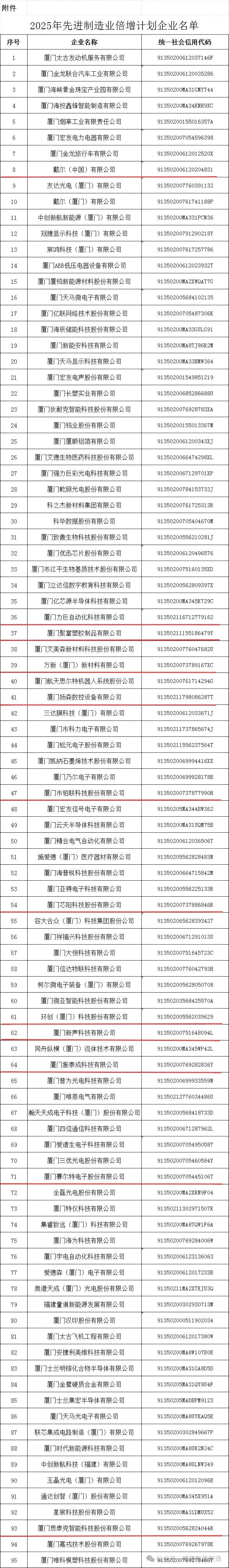 根据《厦门市人民政府关于印发先进制造业倍增计划实施方案(2022—2026年)的通知》(厦府规〔2022〕3号),经研究,现将2025年先进制造业倍增计划企业名单予以公示。