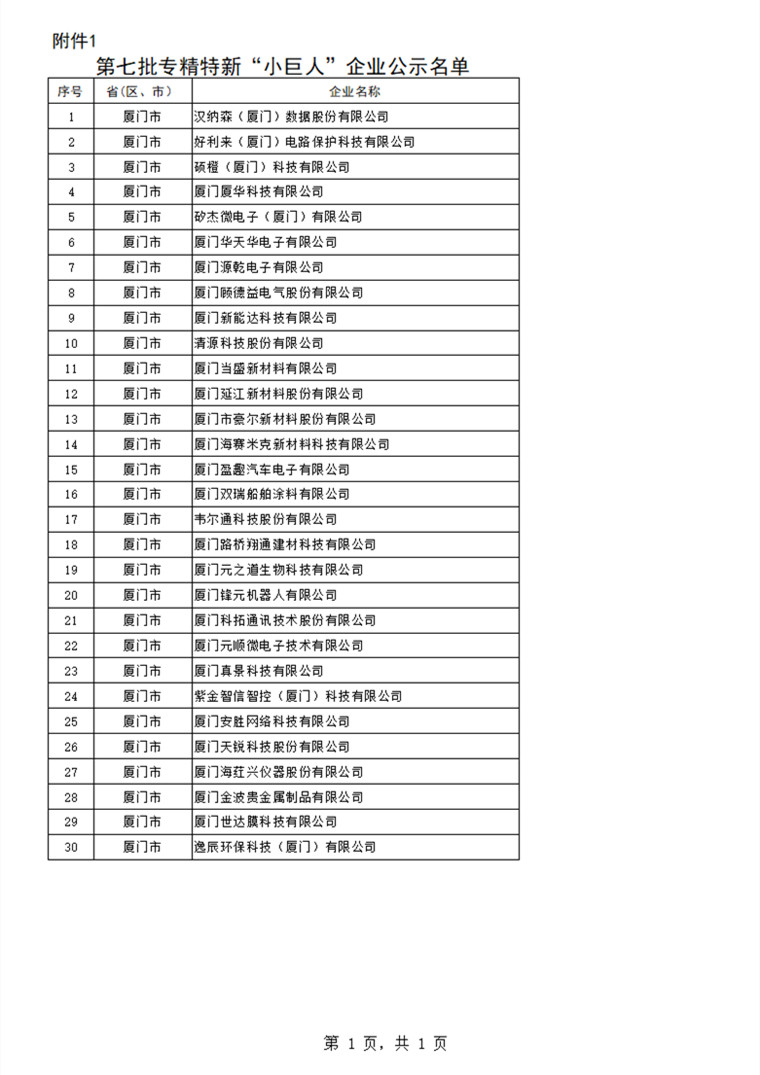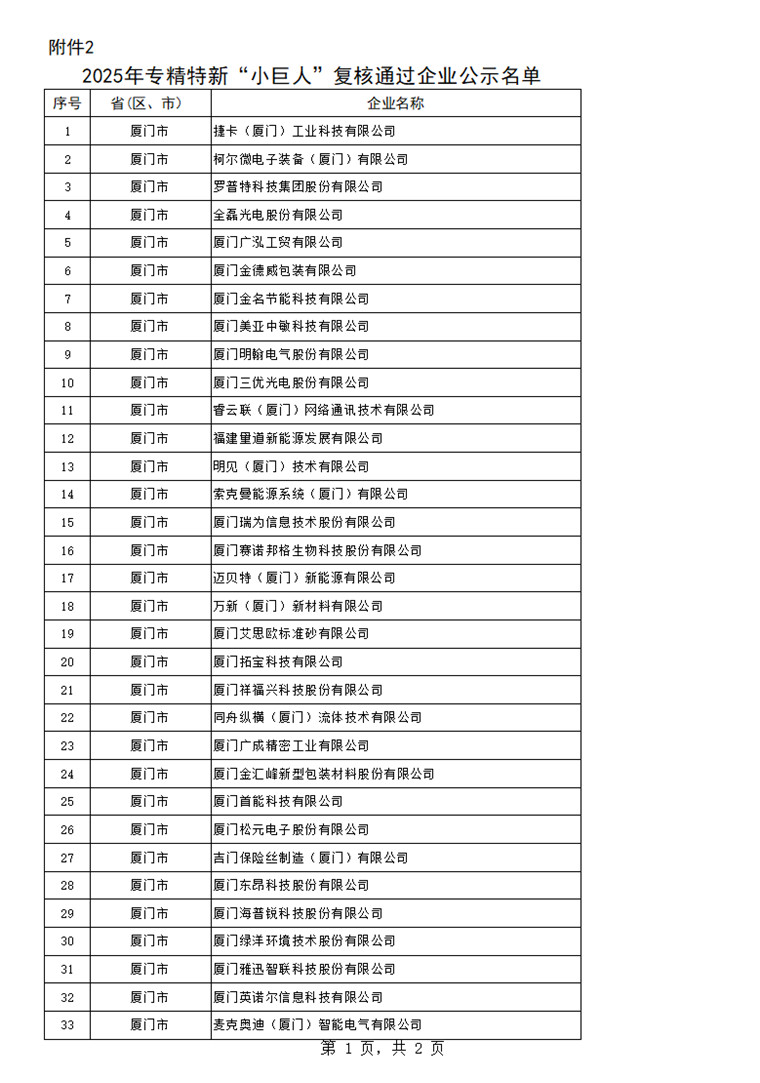 为深入贯彻习近平总书记关于激发涌现九州(中国)专精特新中小企业的重要指示批示精神,工业和信息化部开展了2025年专精特新“小巨人”企业认定和复核工作,已完成相关审核,现将厦门市通过审核的企业名单予以公示(见附件1、2)。